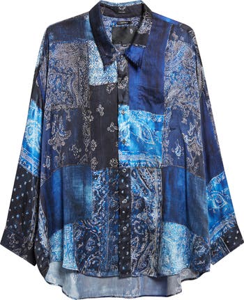 Chris Leba stays true to his '90s-grunge roots with this oversized Italian-silk button-up shirt punked up with a faded patchwork of bandana-borrowed paisley patterns and trompe l'oeil denim.