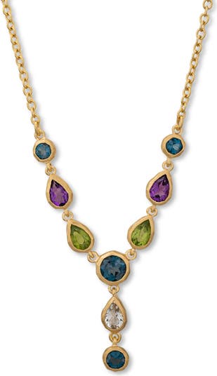 Drop Necklace with Natural Deep Blue Topaz of 1.3 ct., Green Peridot of 1.0 ct., Purple Amethyst of 0.8 ct. and Light Green Prasiolite of 0.5 ct. Romantic and cultural design that can make a statement over a tank top as well as with a gown. A voyage inspired piece, adorned with playful bezels with faceted finish and a kaleidoscope of colors. 100% Handmade in Italy.