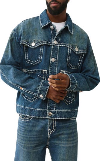 Pronounced topstitching adds character to this faded nonstretch denim jacket framed by dropped shoulders for a relaxed, oversized fit.