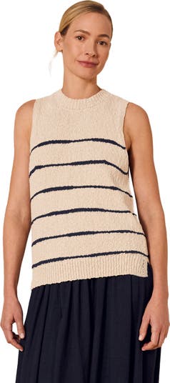 This sleeveless vest top features a drop stitch Breton detail and a simple, regular fit with a crew neckline. Made from a linen and cotton slub yarn blend, it offers a natural texture and breathable comfort, enhanced by ribbed trims and subtle side splits for ease of movement.