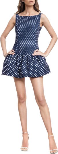 A bubbly hem creates voluminous party-perfect dimension on this leggy-length dress covered in spirited dots and finished with a dipped back.
