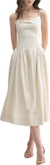 Picot trim at the sweetheart neckline adds a charming touch to this drop-waist midi dress made from a lightweight blend of cotton and linen.