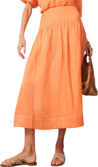 Orange full skirt in a maxi silhouette featuring a dropped waistband, gathered detailing and a zip fastening through the side.