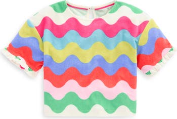 Ruffle-tipped sleeves and a colorful wave pattern sweetens the look of a kid-friendly drop-shoulder top constructed from fleecy-soft cotton blend