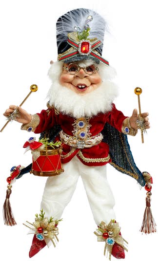 This 11-inch Drummer Boy Elf is a whimsical collectible figure dressed in a richly detailed red velvet coat trimmed with gold and jewels, accented by a regal navy cape. He holds two golden drumsticks and carries a festive red drum adorned with holiday embellishments, ready to march into the season’s celebrations. His cheerful face, white beard, and sparkling accessories bring a joyful touch of Christmas magic to any décor.