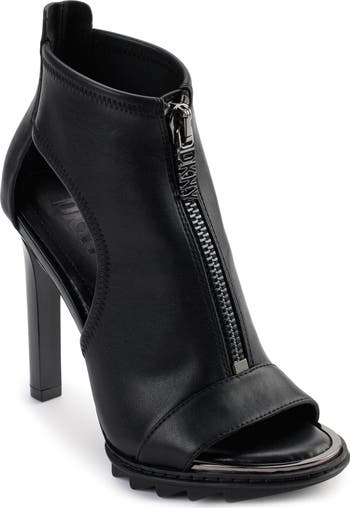 Cutout and zipper details add plenty of edge to this lofty statement sandal.