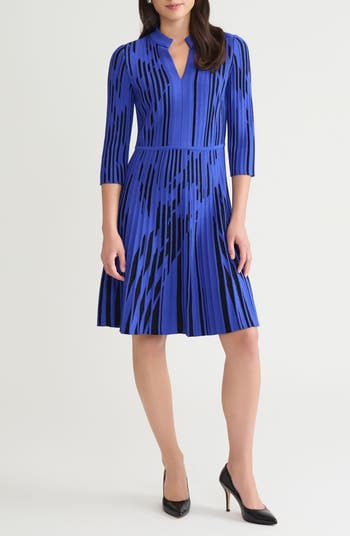 Widely spaced, thick-gauge rib stitching combined with expertly placed jacquard patterning implies a shadowy floral pattern interrupted by pleats on this fit-and-flare dress in a soft yet structured knit.