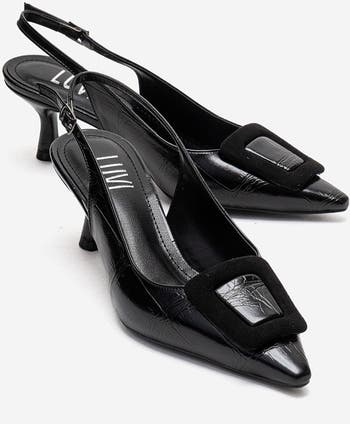 A refined stiletto pump that blends classic elegance with modern detailing and an adjustable back strap