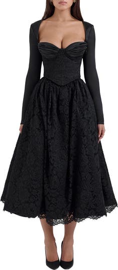 A corset-inspired bodice and voluminous midi skirt create an enchanting aesthetic on a lace fit-and-flare dress accompanied by a long-sleeve satin bolero for evening-ready charm.
