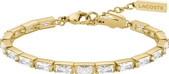 Sparkling baguette-cut crystals line this golden bracelet featuring a clasp shaped in the brand's iconic crocodile.
