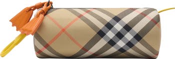 A pencil case in nylon woven with the Burberry Check. The design features colourful duck-themed leather zip pulls. This product is not a toy and is intended for children aged eight years and older.||Hand-painted edges