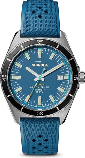 The Detroit-based watchmaker's sporty Duck model is back in a colorful, cool redesign that includes a basket-weave-textured, tropic-style rubber strap and a customized caseback etched with the model's namesake demonstrating one way to test the reliable water resistance this timepiece has always been known for.