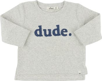 Long sleeve tee with appliqued "dude" across the front Available in infant, toddler and boys sizes. Designed in Minnesota