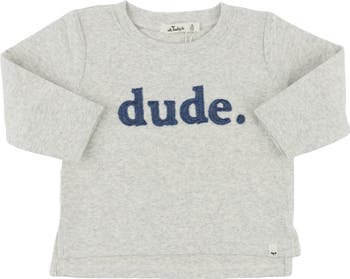 Long sleeve tee with appliqued "dude" across the front  Available in infant, toddler and boys sizes. Designed in Minnesota