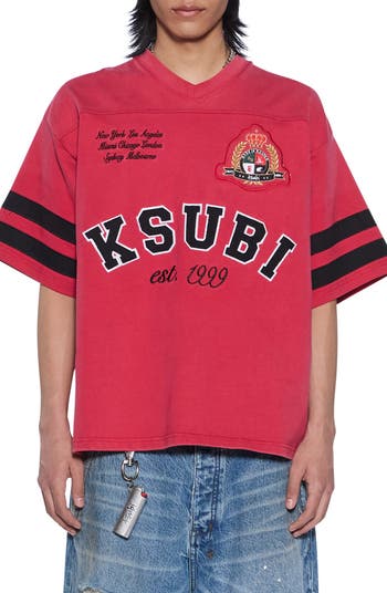 Bold sleeve stripes, collegiate lettering and an embroidered crest team to reinforce the sporty vibe of this V-neck T-shirt cut in a comfortably relaxed fit from soft, heavyweight cotton jersey.