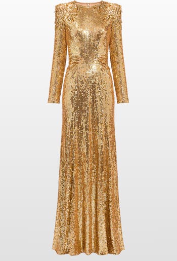 This gown exudes glittery glamour with a sleek, modern silhouette. Designed with long sleeves and a high neckline, it creates a strikingly sophisticated shape, while sequins and beads cover the entire design in a light-catching, liquid-like shimmer. Subtle gathering at the waist enhances the figure, and delicate embellishment at the shoulders adds a final touch of artistry. Crafted for occasions where unforgettable impact is essential.