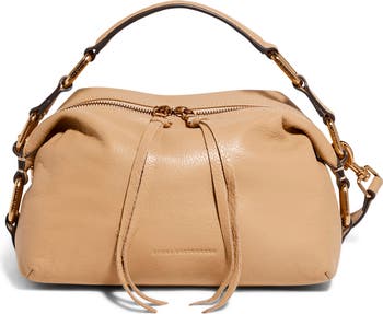Chunky logo-engraved hardware offers counterpoin to the softly rounded silhouette of this versatile leather bag equipped with a top handle and removable crossbody strap.