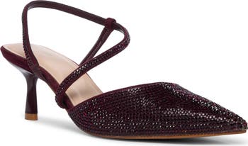 A pointy toe and asymmetric instep strap create stunning dimension on a jewel-encrusted pump lifted by a metallic flare heel that exudes contemporary glamour.