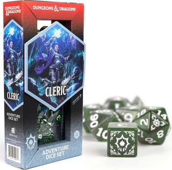 D&D ADVENTURE DICE: CLERIC - GREEN - Channel divine energy with the officially licensed Dungeons & Dragons Adventure Dice Set for Clerics. This green set is designed to reflect the healing and protective powers of the Cleric, with a specific number of dice tailored for casting blessings, curing ailments, and banishing evil. Whether you're a beacon of light in the darkest dungeon or a warrior of the gods, these dice will enhance your sacred duties with every roll. CLERICS draw power from the realms of the gods and harness it to work miracles. Blessed by a deity, a pantheon, or another immoral entity, a Cleric can reach out to the divine magic of the Outer Planes - where Gods dwell - and channel it to bolster people and battle foes. Tabletop roleplaying game accessory. 15 PIECE DICE SET INCLUDES: 3 x d4, 1 x d6, 3 x d8, 3 x d10, 2 x d12, 1 x d%, 2 x d20.
