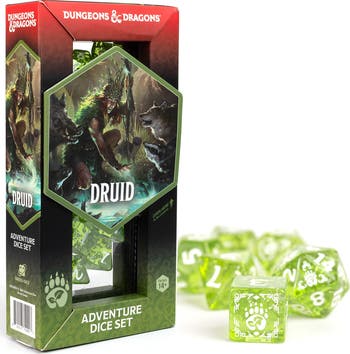 D&D ADVENTURE DICE: DRUID - GREEN - Embrace the power of nature with the officially licensed Dungeons & Dragons Adventure Dice Set for Druids. This earthy green set is crafted to reflect the deep connection Druids have with the natural world, with dice tailored for casting transformative spells and commanding the elements. Whether you're shifting into a beast or summoning the forces of nature, these dice will enhance your Druidic powers with every roll. DRUIDS belong to ancient orders that call on the forces of nature. Harnessing the magic of animals, plants, and the four elements. Druids heal, transform into animals and wield elemental destruction. Tabletop roleplaying game accessory. 15 PIECE DICE SET INCLUDES: 1 x d4, 4 x d6, 8 x d8, 2 x d10, 1 x d12, 1 x d%, 2 x d20.