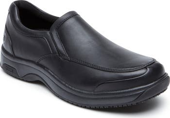 An oil-resistant, slip-resistant sole grounds a stylish slip-on using seam-sealed construction and a microfiber lining for waterproof comfort.