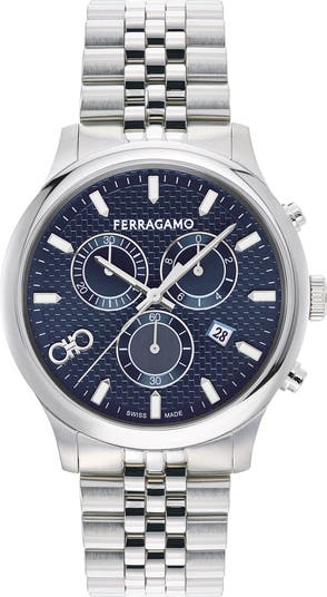 A textured guilloche dial and iconic double-Gancio symbol add signature appeal to a sophisticated chronograph watch set on a polished bracelet.