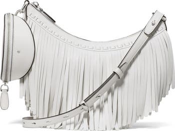 Swingy fringe and a curved topline highlight the crescent shaped profile of a versatile leather bag fitted with a detachable zip pouch that can be worn solo. An adjustable, removable crossbody strap converts for a multitude of styling options.