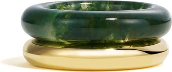 Gleaming contrast defines this organic ring set that stacks 14-karat gold and moss agate bands.