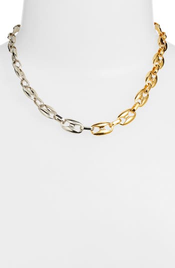 Mariner links create a contemporary necklace split for versatility with 18-karat-gold plating and sterling silver plating.