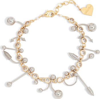 Body-piercing paraphernalia inserts itself between bezel-set cubic zirconia stations on this battle-of-the-accessories handmade bracelet.