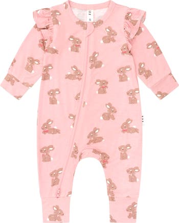 This buttery soft romper is made from the most delicious fabric, baby will love. It has sweet shoulder frills and a cute bunny print. It features a full length, two-way zipper for easy nappy changes and a safety fold zip for peace of mind. Just add squishy legs.