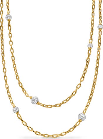 Pavé-diamond covered beads lend sparks of light to this layered chain necklace comprised of alternating smooth and cabled links.