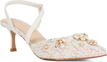 Shimmering charms and pearly beads dazzle on this pointy-toe tweed pump topped with an asymmetric strap.