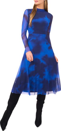 Inky blue mesh updates a striking midi dress in a classic fit-and-flare silhouette with semisheer sleeves and a mock neck.