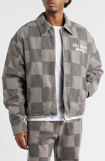 A raw hem and washed checker print add to the vintage vibe of this workwear-inspired canvas jacket.