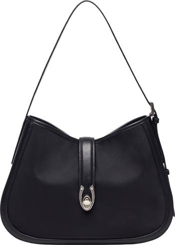 Polished logo hardware and smooth leather trims highlight the durable nylon exterior of a spacious shoulder bag featuring multiple pockets and an adjustable strap for on-the-go convenience.