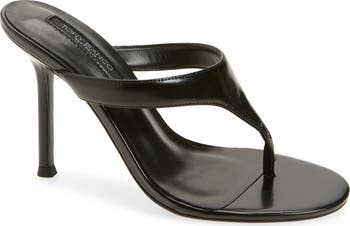 A center toe post offers a secure fit on a glossy leather flip-flop set on a towering stiletto heel for striking height.