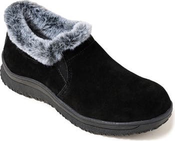 A sturdy rubber sole and water-resistant suede make this faux-fur slipper bootie a versatile option for indoor and outdoor wear.