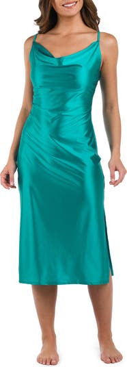 Satiny smooth fabric graces your figure in a classic sheath with an elegantly draped cowl neck.