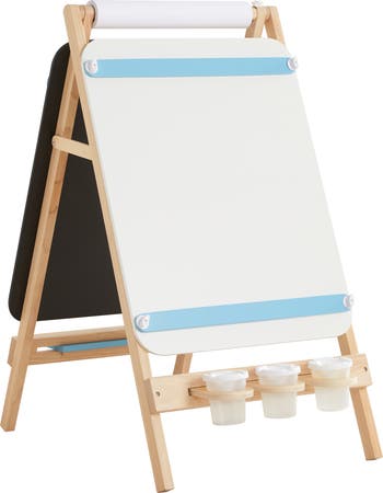 Additional features: Easel comes with a pull-down paper roll that can be held in place with the included circle magnets. A shelf and cup holders fit easily in and out of the slots. The easel also folds flat for easy, convenient storage.