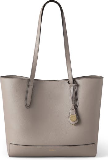 A key-ring accent with a logo-etched charm brings understated sophistication to a softly structured tote crafted with richly pebbled leather and slender carry straps.