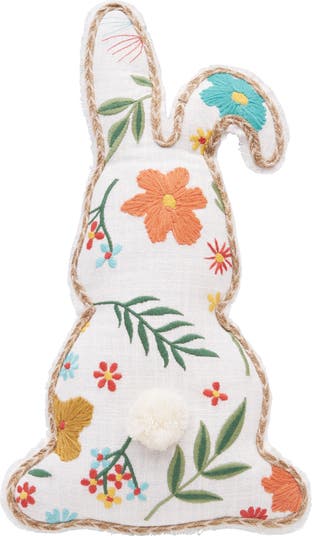 - Crafted from cotton blend fabric with raised embroidery work that provides artisan quality and tactile dimension, outlined with natural braided rope piping that defines the bunny shape beautifully and adds rustic farmhouse texture to complement the floral embellishments throughout.