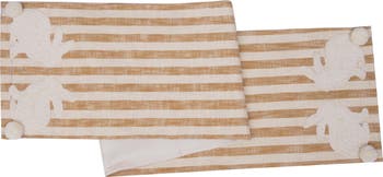 - This 100% cotton table runner features a tan and cream horizontal stripe ground with white tufted Easter bunny appliqués and small pom-pom accents at each end, creating a charming, texture-rich seasonal accent with cottage-inspired warmth.