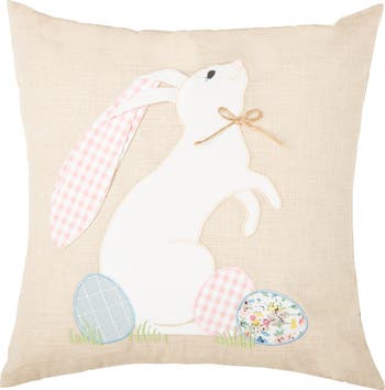 Welcome spring with the Easter Bunny Eggs Appliqué Accent Throw Pillow, an 18-by-18-inch 100% polyester pillow featuring a charming patchwork appliqué design on a natural linen-look ground. A large white bunny appliqué sits at center, with pink gingham check ear lining and a jute twine bow tied at the neck. At the base, three patchwork Easter eggs in blue lattice, pink gingham, and a soft floral print nestle in a bed of green embroidered grass, completing the festive spring tableau. The multiple fabric appliqué pieces bring a handcrafted, quilted-patchwork character to the design, with each element adding its own texture and pattern for a visually layered and cottage-inspired result. The jute twine bow adds a natural, farmhouse-friendly finishing touch that ties the composition together. Crafted from 100% polyester, this pillow is comfortable for everyday accent use and easy seasonal display. The soft pastel palette suits Easter and spring-themed interiors, and this pillow makes a thoughtful and festive gift for anyone who loves whimsical, seasonal home accents.