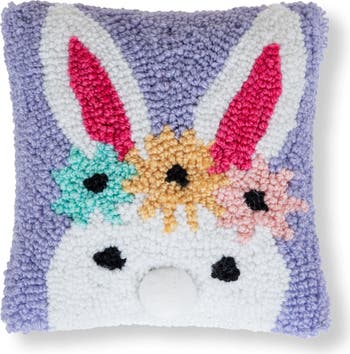- This charming hooked accent pillow features an adorable white bunny face with tall ears in cream and pink, crowned with a trio of cheerful flowers in turquoise, golden yellow, and soft pink against a lovely lavender background that brings springtime joy to any space in your home.