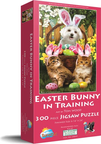 Indulge in the magical world of Easter with the delightful "Easter Bunny in Training" 300 piece jigsaw puzzle by SunsOut Inc. Created by renowned artist Tom Wood, it captures the innocence and playfulness of adorable animals dressed in Easter bunny attire. The vibrant, intricately detailed scene offers a serene escape while challenging your puzzle-solving skills. With a finished size of 16" x 26", it makes a displayable artwork you would be proud to showcase. Meticulously crafted with interlocking pieces from high-quality recycled cardboard, SunsOut puzzles ensure durability and smooth assembly for hours of uninterrupted enjoyment. More than just a beauty to behold, these puzzles are made with the environment in mind. As a woman-owned small business, SunsOut uses recycled materials and soy-based inks, proudly supporting sustainability without compromising quality. Proudly made in the USA, your peace of mind is guaranteed with SunsOut's high manufacturing standards and commitment to customer satisfaction. The vibrant, full-color display box makes this puzzle an ideal Easter gift for the puzzle lovers in your life or a charming addition to your own collection. Delve into the joyous spirit of Easter with the dual pleasure of artistic excellence and puzzling challenge.
