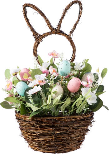 This 18"H Easter Bunny Shaped Basket Centerpiece features a charming wicker basket with bunny ears. It’s filled with pastel Easter eggs, pink and white flowers, and green foliage, making it a perfect festive accent for Easter tables.