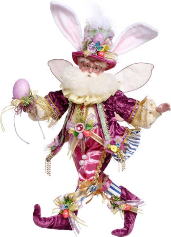 The Easter Egg Fairy (Medium - 17.5 Inches) is a whimsical collectible figure dressed in luxurious spring hues of pink, purple, and gold velvet. Adorned with sparkling gems, ribbons, flowers, and pastel Easter eggs, this charming fairy brings festive elegance to any holiday display. With playful bunny ears, a fluffy beard, and intricate detailing, it captures the joyful magic of Easter with sophistication and cheer.