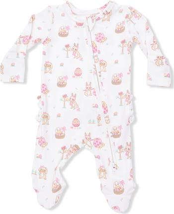 Baby will look as sweet as ever in a soft and stretchy footie covered in a whimsical Easter-themed print of chicks, bunnies and vibrant eggs.