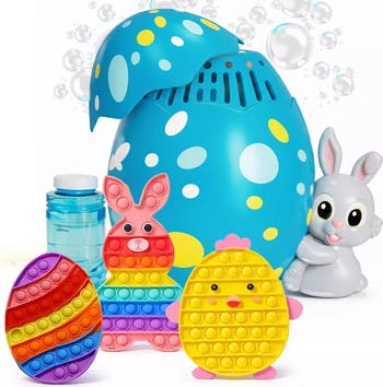 Bring extra excitement to Easter celebrations with this playful toy bundle featuring colorful pop it fidget toys and a bunny bubble maker. This set includes three rainbow pop it toys shaped like a bunny, chick, and egg, paired with a festive Easter egg bubble machine. The pop it toys provide satisfying push and pop feedback that supports focus, fine motor engagement, and calming sensory play. Crafted from soft, durable, BPA free silicone, they are lightweight, safe, and designed for repeated use. The bubble maker adds outdoor fun with streams of floating bubbles, creating laughter and festive magic during egg hunts, parties, and springtime play. Designed to be easy for little hands to operate, the battery powered bubble blower is portable and lightweight for backyard adventures and seasonal activities. Perfect as Easter basket stuffers, party favors, classroom rewards, or springtime gifts, this bundle blends soothing sensory play with active outdoor entertainment for joyful holiday memories.